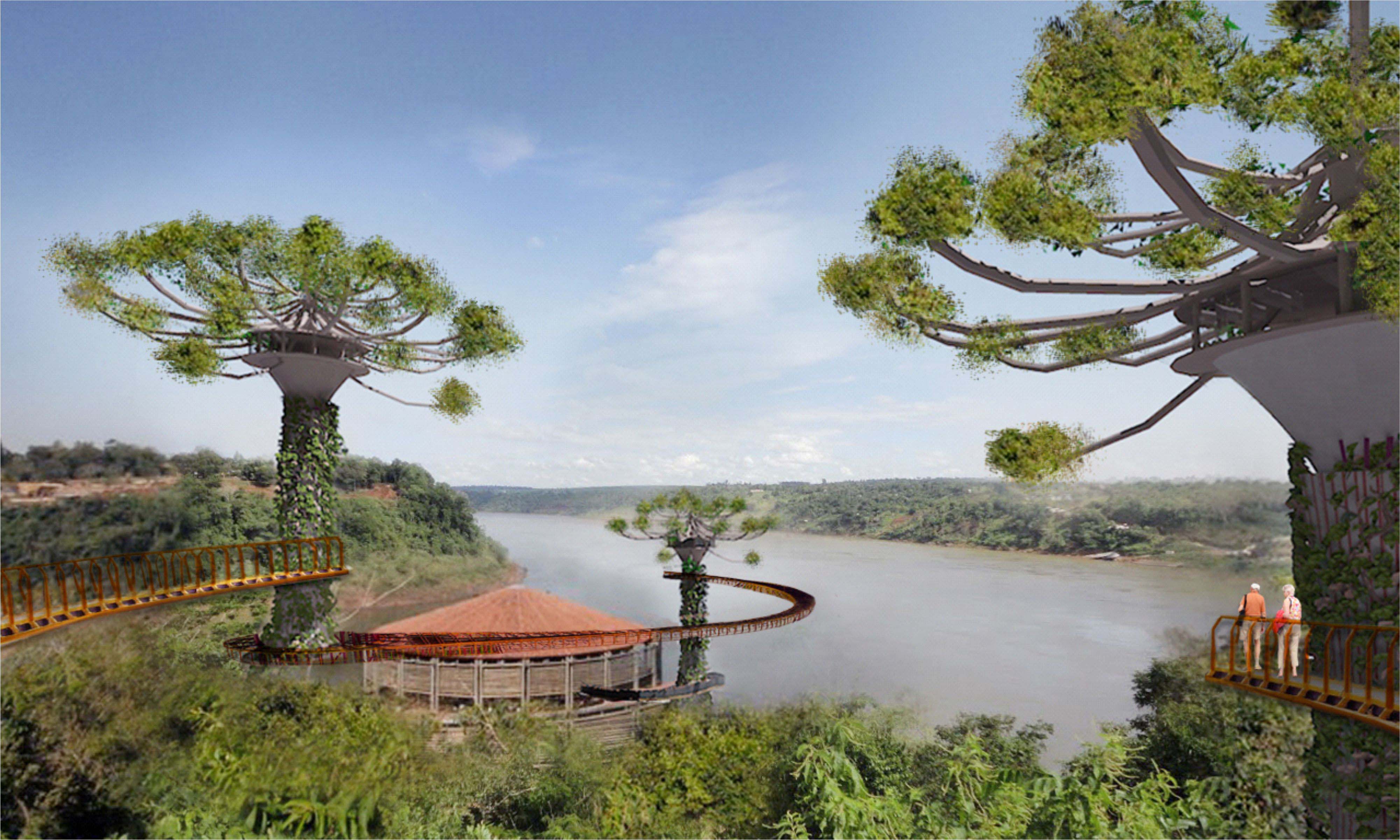 A proposta da consultoria contratada prevê a construção de três árvores gigantes interligadas por passarelas (elas seriam de concreto e metal, revestidas por vegetação). A estrutura é inspirada no Gardens By the Bay, o Jardim Botânico de Cingapura. “Nesse processo também seria revitalizado o Marco das Três Fronteiras e Espaço das Américas”, informou Nascimento.