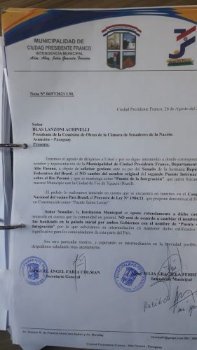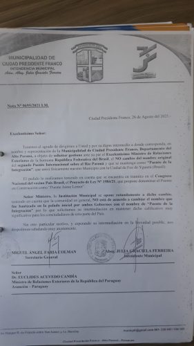 Ao ministro das Relações Exteriores do Paraguai, Euclides Acevedo Candía, a Prefeitura de Presidente Franco pede o diálogo com a chancelaria brasileira. Do presidente da Comissão de Obras do Senado, Blas Lanzoni Achinelli, o município requer o debate da pauta com os senadores do Brasil.