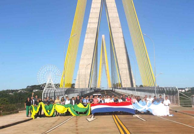 Confraternização no meio da ponte para ressaltar a integração trinacional – foto: Divulgação