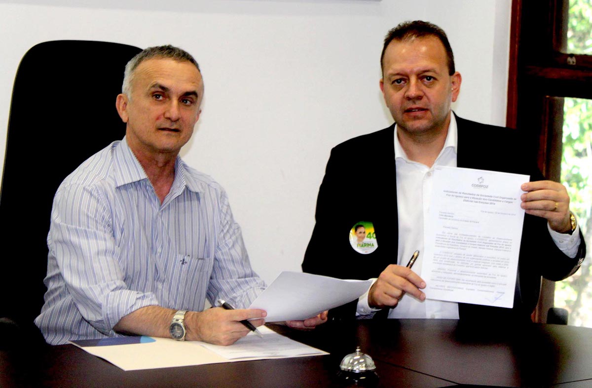O candidato ao governo do Paraná Tulio Bandeira recebeu o termo de compromisso com as propostas da sociedade iguaçuense, nesta quinta-feira, 2, em Foz do Iguaçu