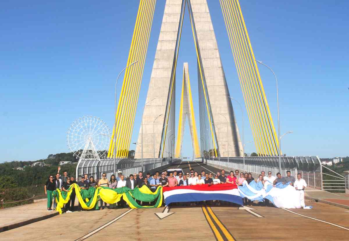 Lideranças de cinco cidades da Argentina, Brasil e Paraguai celebraram a união no meio da nova ponte; Presidente Franco sediou reunião do Conselho de Desenvolvimento.