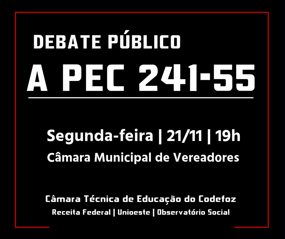 A Proposta de Emenda à Constituição (PEC) 241-55/16, conhecida como “PEC do Teto de Gastos”, será tema de debate público nesta segunda-feira, 21, às 19 horas, na Câmara de Vereadores. O encontro é promovido pela Câmara Técnica de Educação do […]